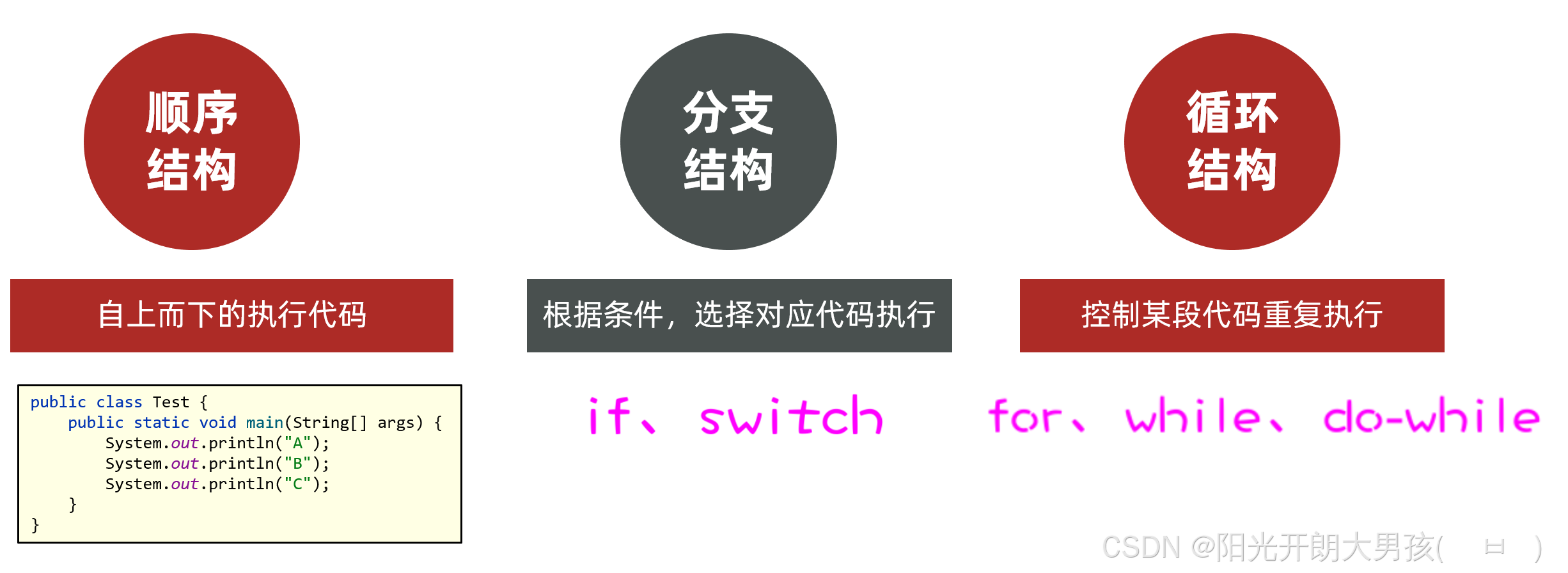 先给同学们介绍一下,程序有哪些流程控制、以及Java提供了哪些方案来控制程序的执行顺序?
