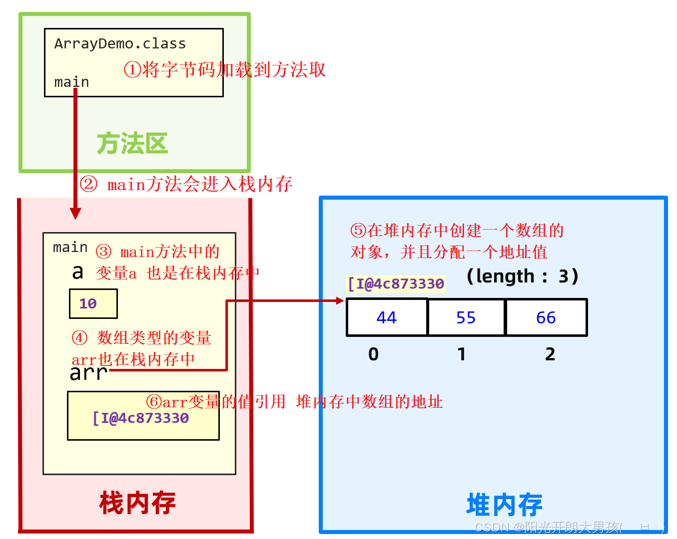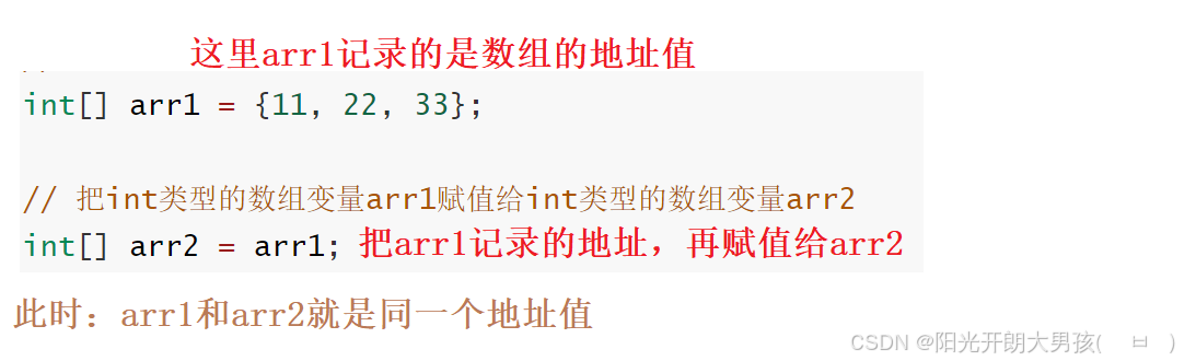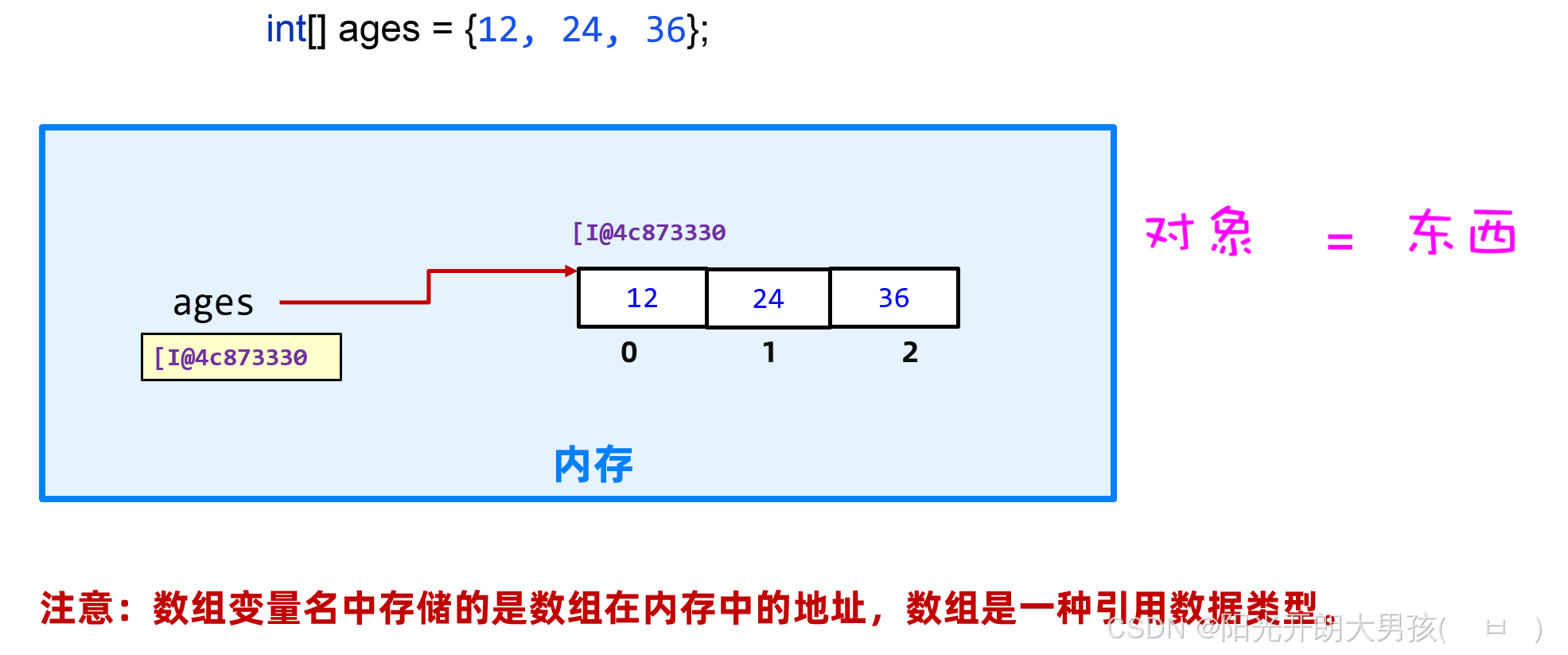 {12,24,36}表示创建一个数组对象,你完全可以把它理解成一个能装数据的东西。这个对象在内存中会有一个地址值[I@4c873330,每次创建一个数组对象都会有不用的地址值。 - 然后,把右边的地址值