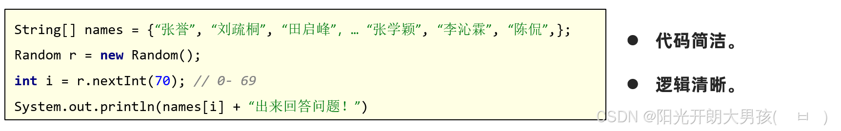 各位同学,通过数组元素反转的案例,我们学会了如何对两个数据进行交换。接下来,我们再学习随机排名案例,将数据交换的思路再巩固一下。