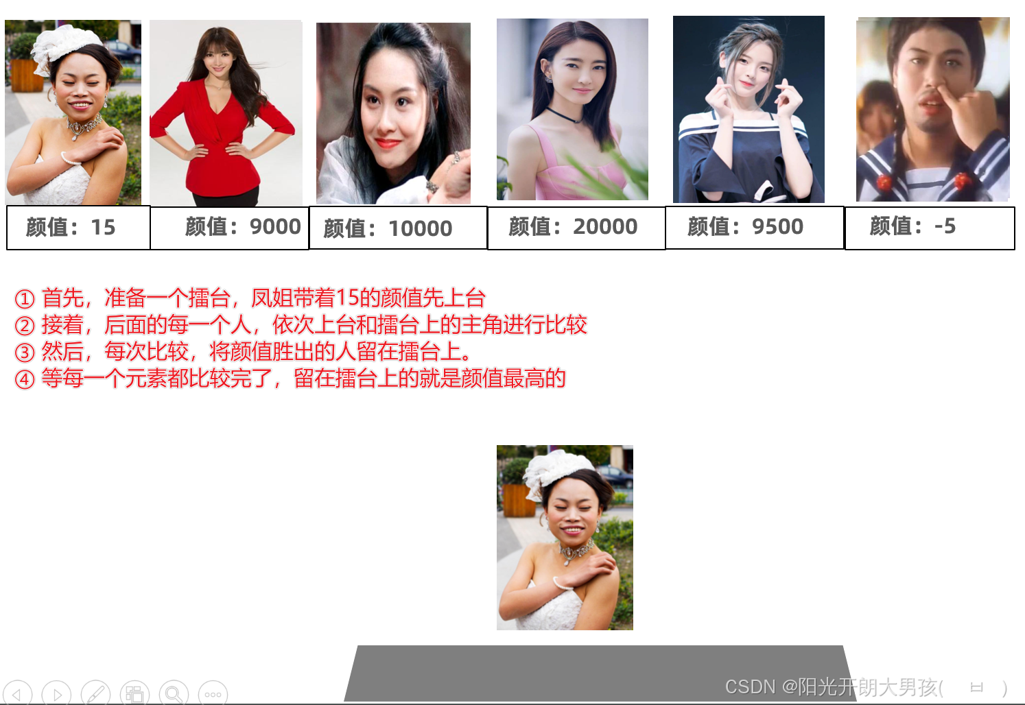 我们先看一下选美比赛,是怎么选出颜值最高的人的。然后再以此思路,来写代码找出数组中元素的最大值。