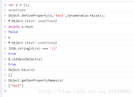 在这种情况下,楼主想到的办法是,使用Object.getOwnPropertyNames(obj)来获取对象obj的属性名称,该方法返回一个数组,若数组的长度为0,则obj此时为{};以下是在浏览器上测试的结果:
