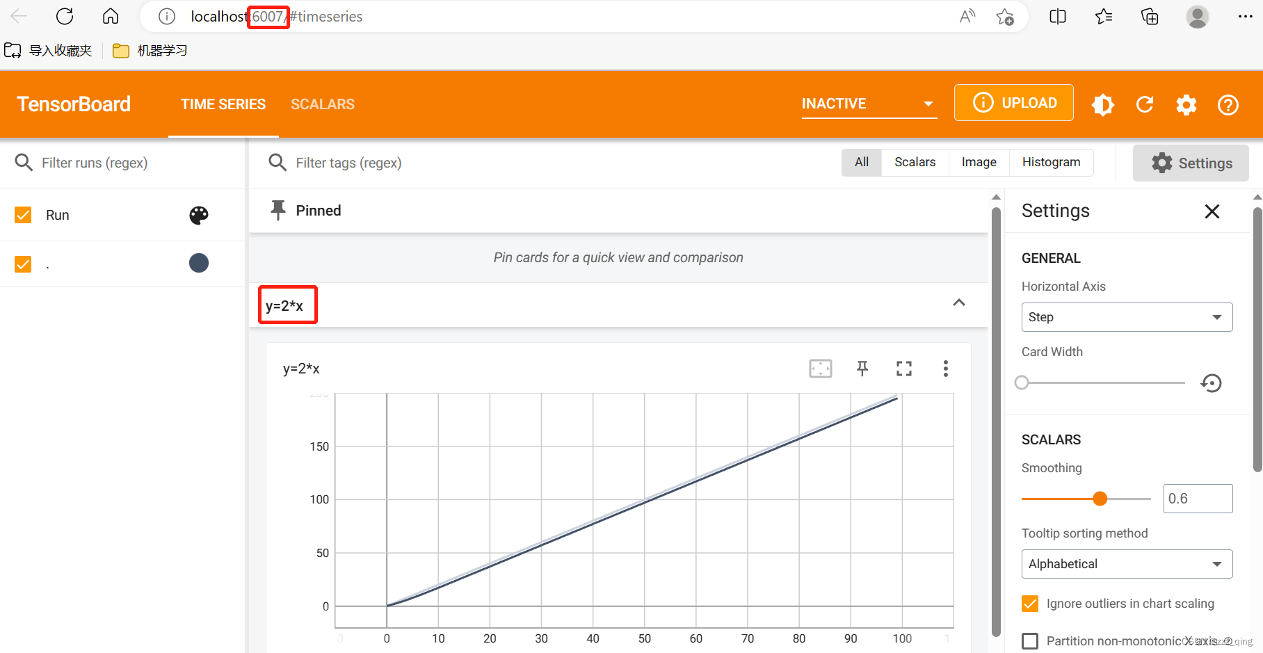 运行以上代码后,生成log目录下的一个events文件,在Terminal中使用tensorboard --logdir=logs指令打开这个文件,默认端口号为6006(如果显示tensorboard : 无法将“tensorboard”项识别为 cmdlet、函数、脚本文件或可运行程序的名称,需要把环境变量配置好):