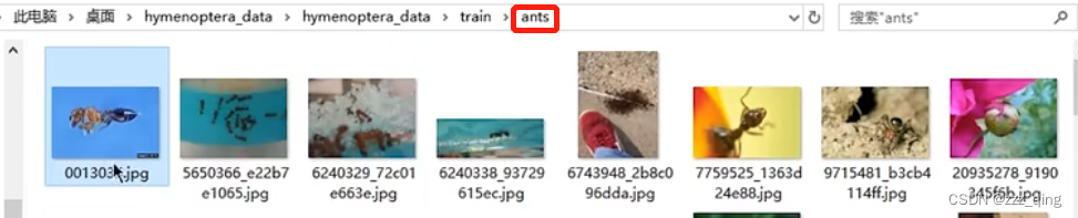 - 组织方式一:二分类问题,把data分成两个文件夹,文件夹名就是它的lable。比如蚂蚁和蜜蜂的分类,下图中ants就是这个文件夹中这些图片的lable。