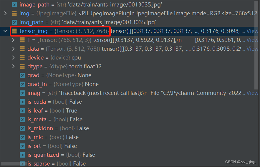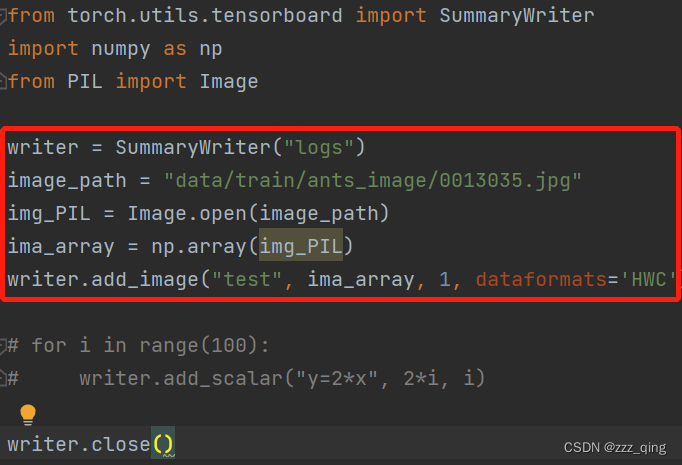 from PIL import Image from torchvision import transforms from torch.utils.tensorboard import SummaryWriter img_path = "data/train/ants_image/0013035.jpg" img = Image.open(img_path) # 1.transform该如何使用 tensor_trans = transforms.ToTensor() tensor_img = tensor_trans(img)