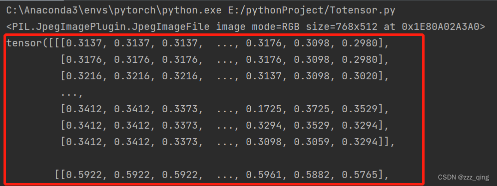 运行上面代码得到的tensor数据tensor_img的内容如下,Tensor数据类型可以理解为一个包装了神经网络的一些理论基础所需要的一些参数的数据类型。