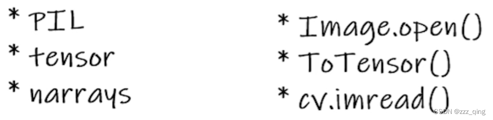 使用Transforms,就是使用Transforms这个python文件当中各种各样的类,不同的类有不同的作用。在使用Transforms时,我们要关注输入、输出、作用这三个点。图片会有不同的格式,所以输入和输出是比较容易错的点。图片不同格式对应的打开方式如下: