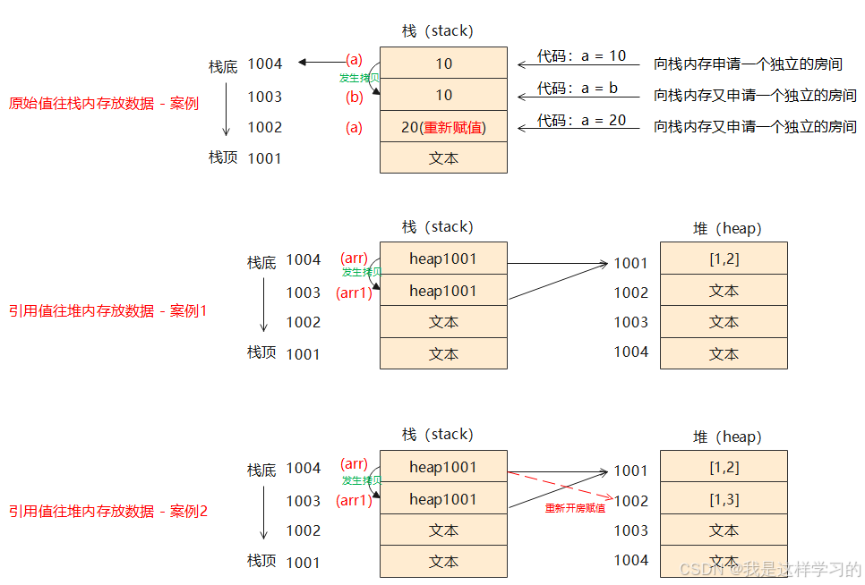 - 第三案例是重新对原数组赋值,重新赋值意味着:堆内存数据重新开新房间,新房间对应的地址也跟着变