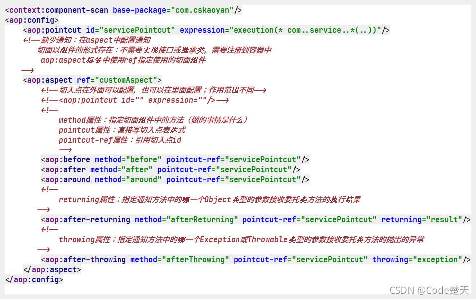 这里要注意,切入点可以再外面切面外面配置也可以在切面里面配置,区别就是作用范围不一样,写在外面就是全局的作用范围,写在里面就是针对当前切面的作用范围